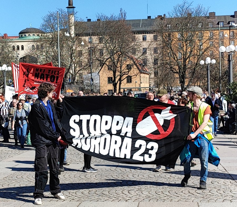 Placards and banners with messages such as "No to NATO", "NATO's war will get our children killed for a dollar," and "Stop Aurora 23" -- referring to an ongoing military exercise with 26,000 participants mainly from NATO member states currently hosted by Sweden -- were seen as the protesters moved through the city.