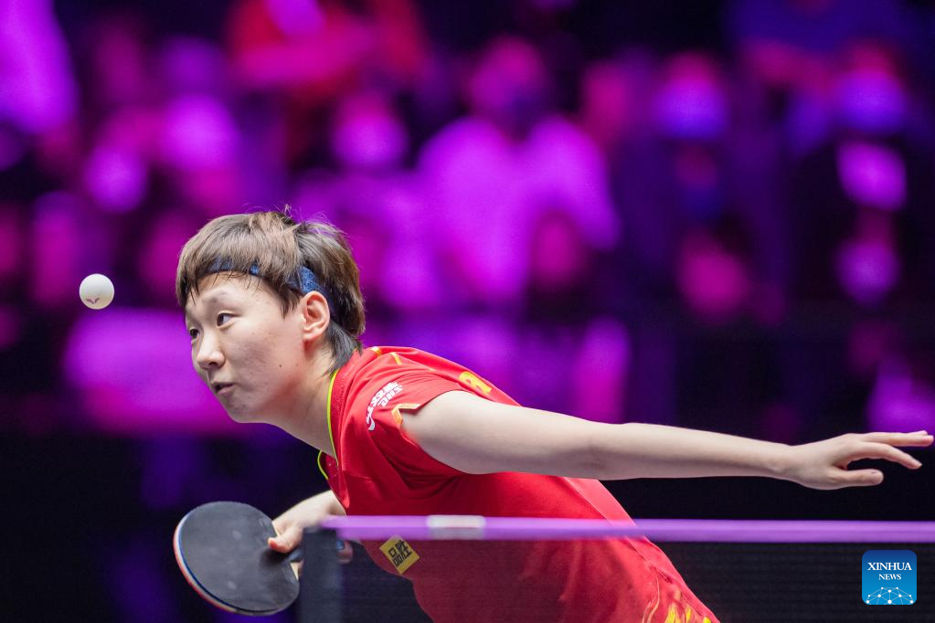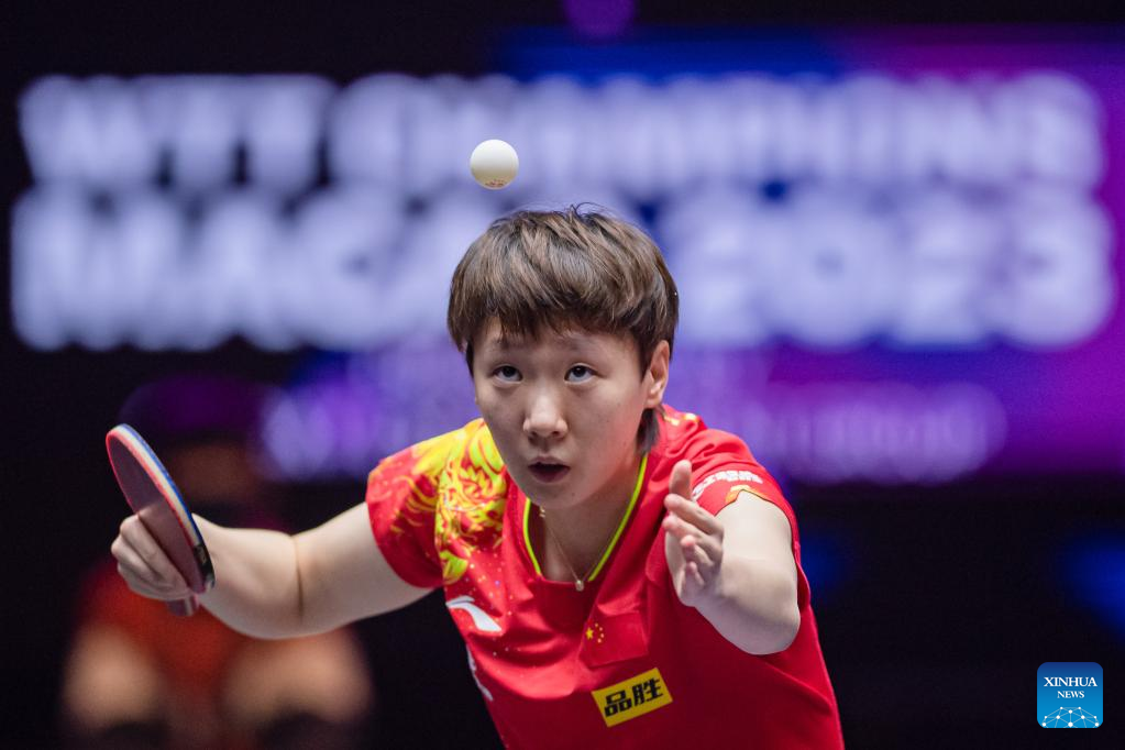 Wang Yidi of China hits a return during the women's singles semifinal match against her teammate Wang Manyu at the WTT Champions Macao 2023 in Macao, south China, April 22, 2023. (Xinhua/Cheong Kam Ka)