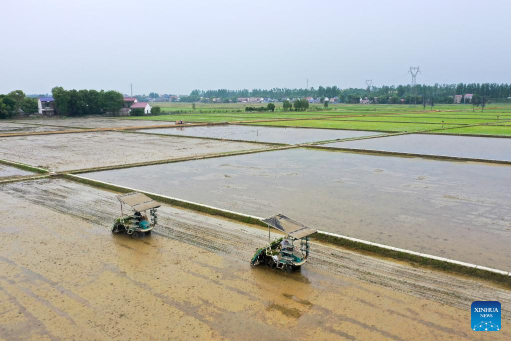 This aerial photo taken on April 21, 2023 shows farmers driving rice transplanters to transplant rice seedlings in Zhongtang Village of Heshan District in Yiyang, central China's Hunan Province. Agricultral machines such as rice transplanter, rotary tiller and drones have helped streamlining the spring ploughing here. (Xinhua/Xue Yuge)