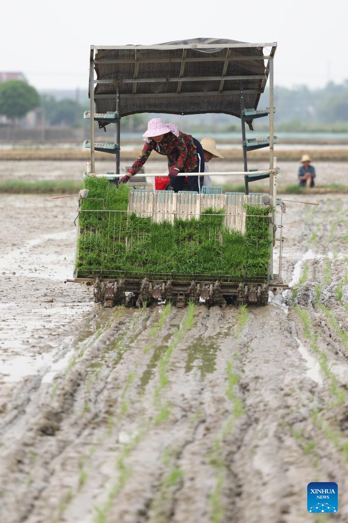 Farmers drive a rice transplanter to transplant rice seedlings in Zhongtang Village of Heshan District in Yiyang, central China's Hunan Province, on April 21, 2023. Agricultral machines such as rice transplanter, rotary tiller and drones have helped streamlining the spring ploughing here. (Xinhua/Xue Yuge)