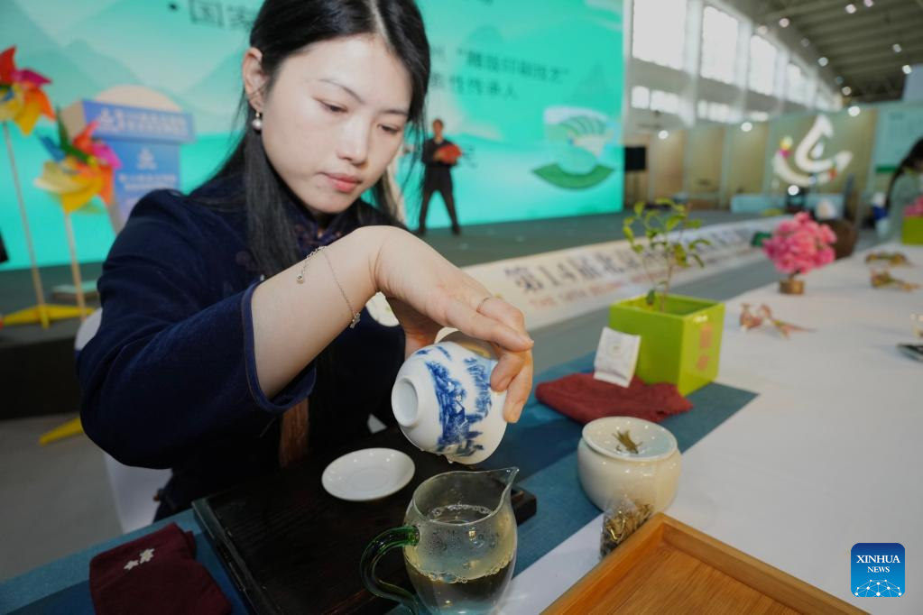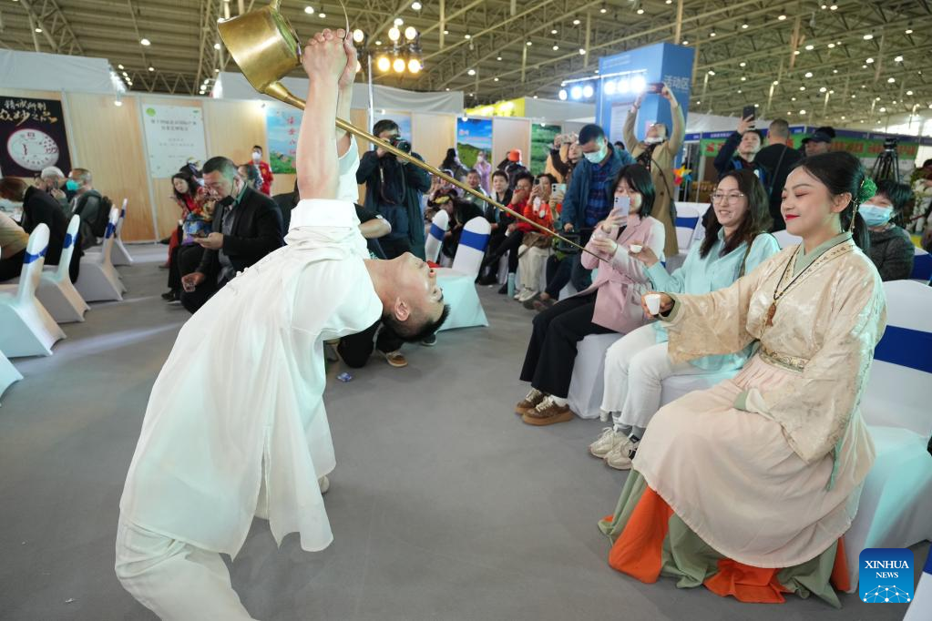 A tea artisan performs at Beijing International Tea and Tea Ceremony Exhibition in Beijing, capital of China, on April 21, 2023. The four-day event will last till April 24. (Xinhua/Cai Yang)