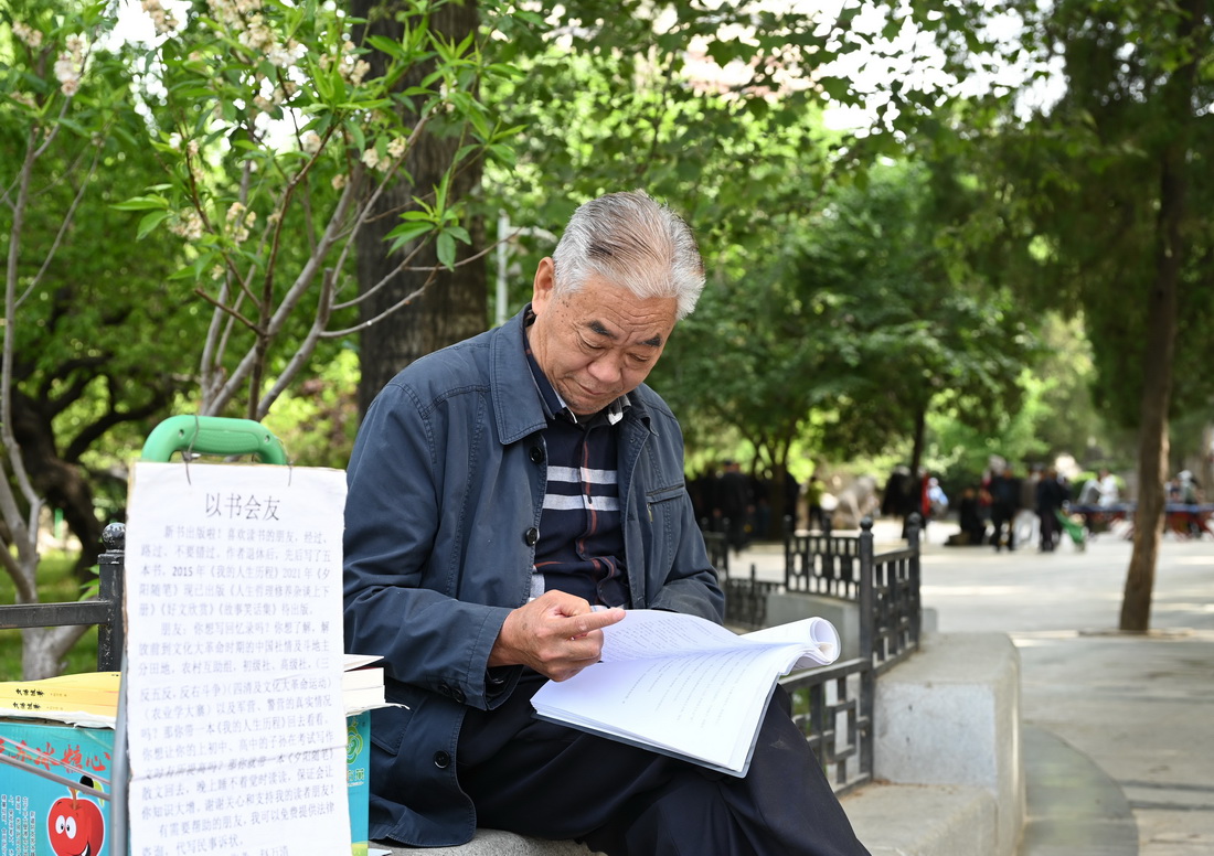 Zhao Wanqing, a retired police officer, reads at Renmin Park in Zhengzhou, capital of central China's Henan Province, April 16, 2023. (People's Daily Online/Wang Yuxing)