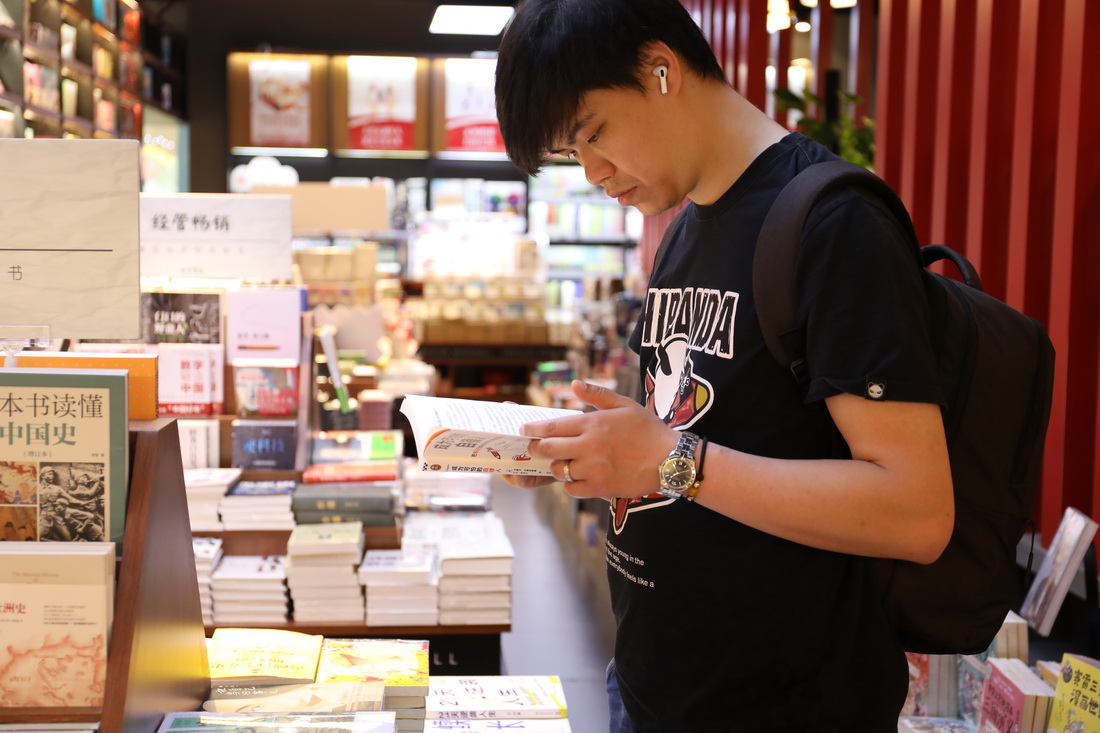 A man reads at the Popular Bookmall in Shanghai, April 21, 2023. (People's Daily Online/Gong Sha)