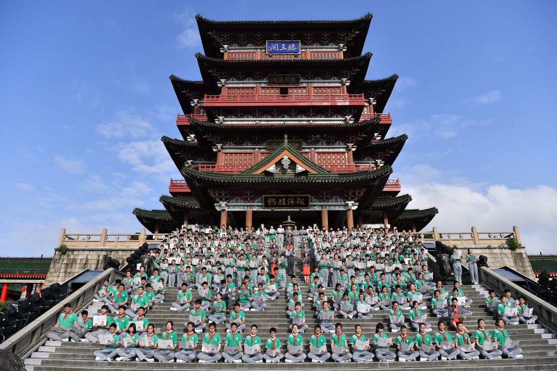 About 400 teachers and students read aloud the Preface to the Pavilion of Prince Teng, a famous prose written by poet Wang Bo in the Tang Dynasty (618-907), during an event to celebrate World Book Day at the Pavilion of Prince Teng in Nanchang, capital of east China's Jiangxi Province, April 21, 2023. (People's Daily Online/Shi Yu)