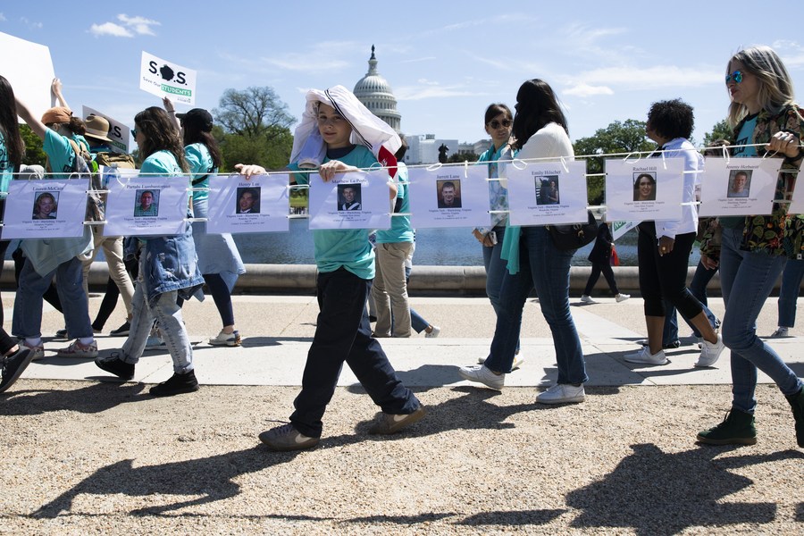 People display photos of victims of gun violence during a march to the Capitol to protest for a ban on assault weapons, in Washington, D.C., the United States, on April 17, 2023. (Photo by Aaron Schwartz/Xinhua)