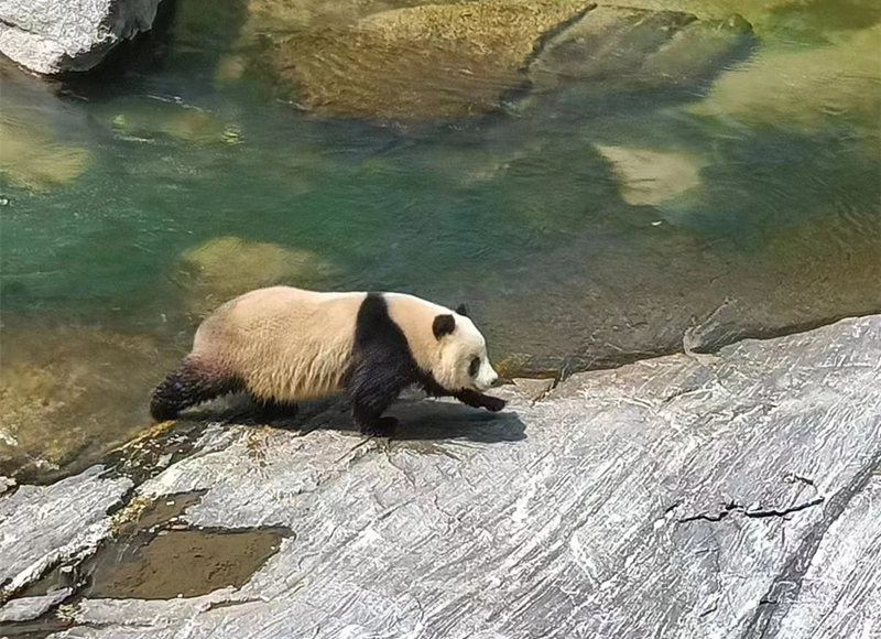 A wild giant panda crosses a river in Foping county, Hanzhong city, northwest China's Shaanxi Province on April 19, 2023. (Photo/Chen Li)