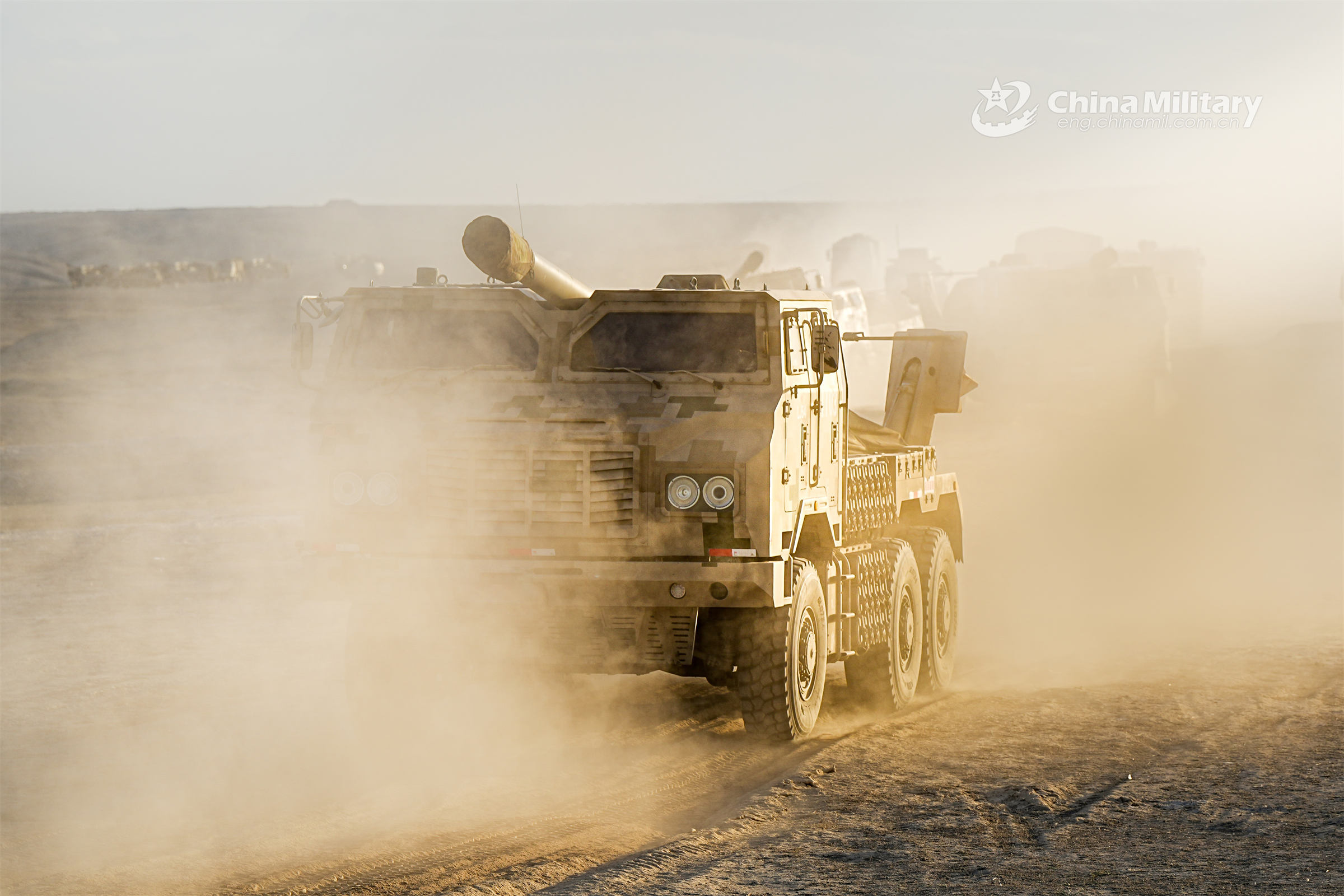 Truck-mounted artillery systems attached to an artillery element with a regiment under the PLA Xinjiang Military Command kick up plumes of dust en route to the designated area during a tactical maneuver training exercise on April 3, 2023. (eng.chinamil.com.cn/Photo by Zhou Yubin)