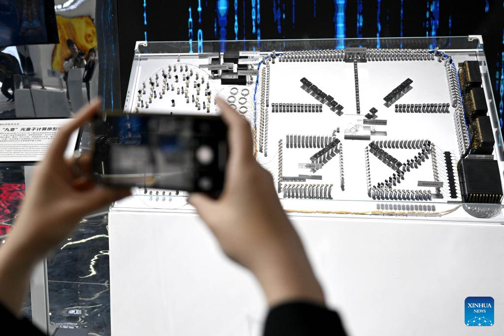 A visitor takes photos of a model of the quantum computing prototype "Jiuzhang" at the 2nd China (Anhui) Science and Technology Innovation Achievement Transformation Fair held in Hefei of east China's Anhui Province, April 26, 2023. The three-day 2nd China (Anhui) Science and Technology Innovation Achievement Transformation Fair kicked off in Hefei Wednesday. (Xinhua/Huang Bohan)