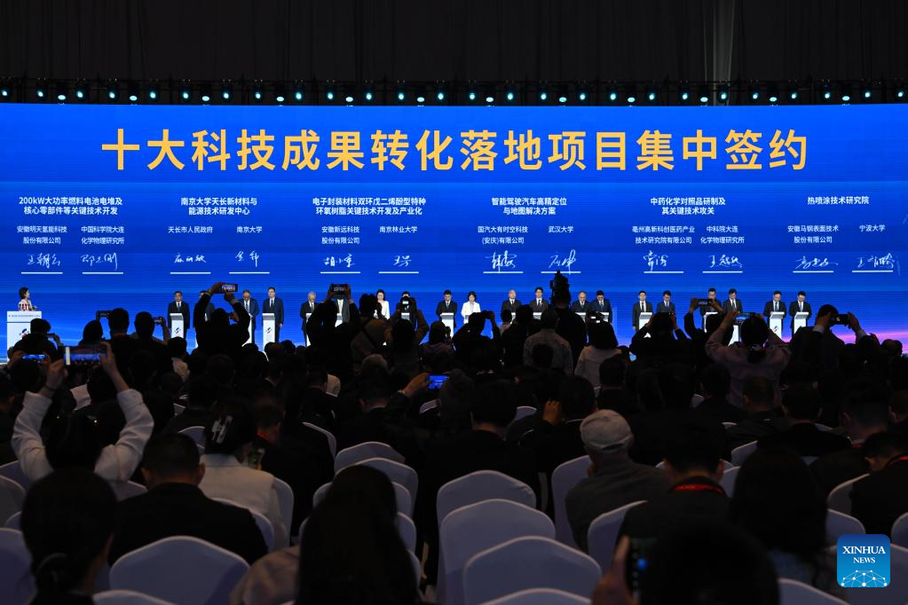 This photo taken on April 26, 2023 shows the signing ceremony at the 2nd China (Anhui) Science and Technology Innovation Achievement Transformation Fair held in Hefei of east China's Anhui Province. The three-day 2nd China (Anhui) Science and Technology Innovation Achievement Transformation Fair kicked off in Hefei Wednesday. (Xinhua/Huang Bohan)