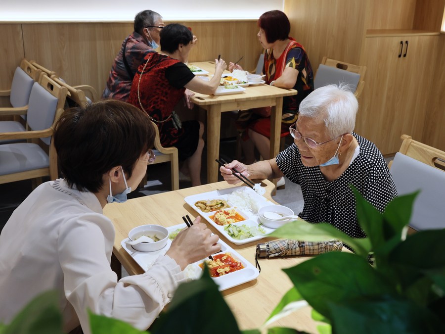 Senior citizens have meals at a canteen for elderly people at a community in Jin'an District of Fuzhou, capital of southeast China's Fujian Province, June 21, 2022. (Xinhua/Jiang Kehong)