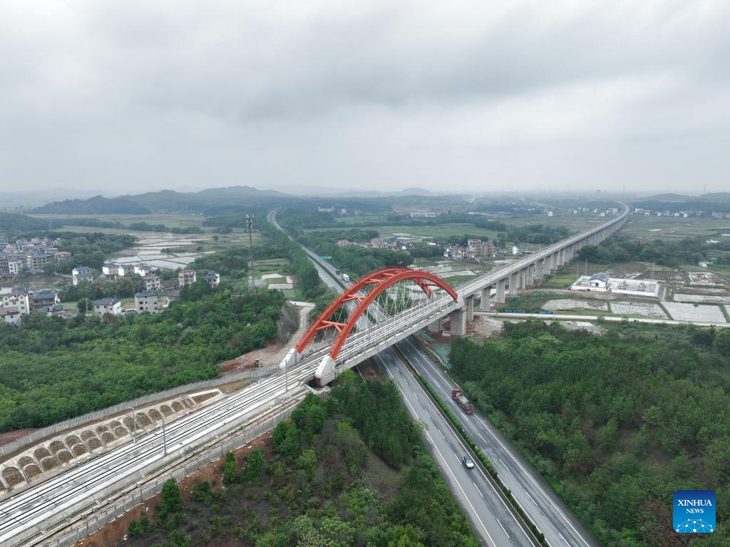 This aerial photo taken on April 25, 2023 shows the Nanchang-Jingdezhen-Huangshan high-speed railway in east China's Jiangxi Province. The last 500-meter-long track was laid on the Nanchang-Jingdezhen-Huangshan high-speed railway on Wednesday, marking the completion of the track-laying work for the 290-kilometer-long railway, which links Nanchang, Shangrao, Jingdezhen in Jiangxi and Huangshan in east China's Anhui. (Xinhua/Peng Zhaozhi)