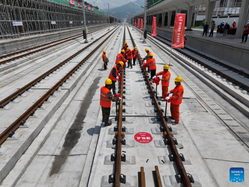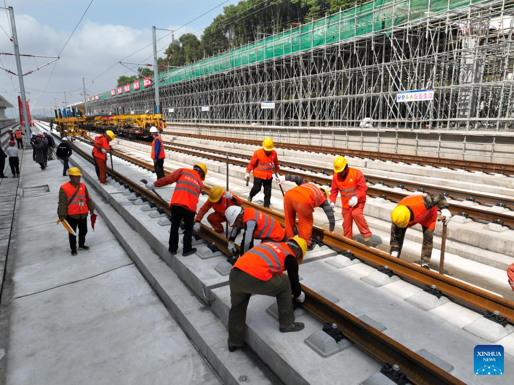 Staff members lay the track at the construction site of the Fuliang east railway station along the Nanchang-Jingdezhen-Huangshan high-speed railway in east China's Jiangxi Province, April 26, 2023. The last 500-meter-long track was laid on the Nanchang-Jingdezhen-Huangshan high-speed railway on Wednesday, marking the completion of the track-laying work for the 290-kilometer-long railway, which links Nanchang, Shangrao, Jingdezhen in Jiangxi and Huangshan in east China's Anhui. (Xinhua/Peng Zhaozhi)