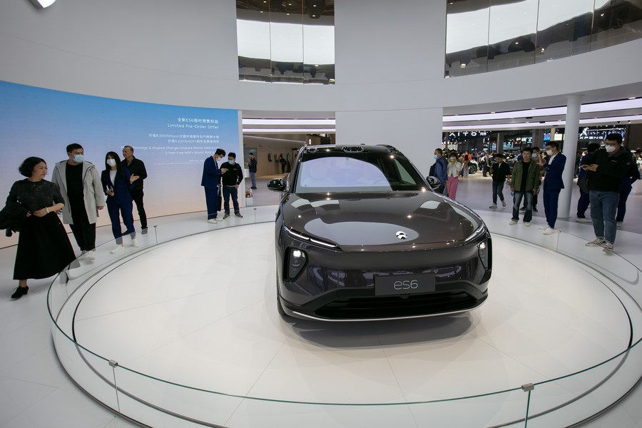 People look at a NIO ES6 on display during the 20th Shanghai International Automobile Industry Exhibition in Shanghai, east China, April 25, 2023. (Xinhua/Wang Xiang)