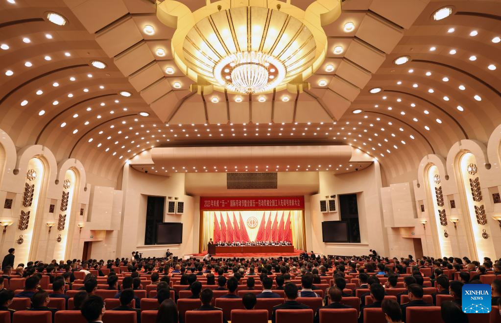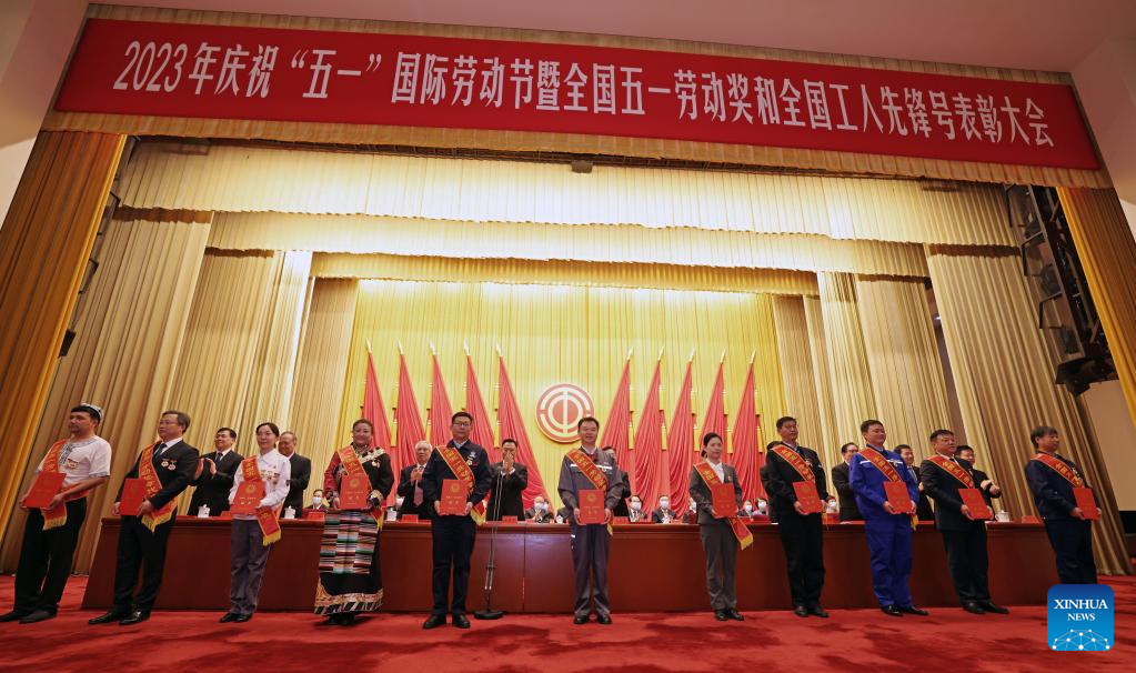 This photo taken on April 27, 2023 shows a meeting marking the upcoming International Labor Day in Beijing, capital of China, April 27, 2023. Exemplary units and workers were presented with national labor awards and honorary titles at the meeting. (Xinhua/Cai Yang)