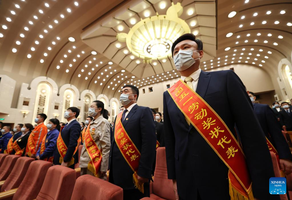 Attendees sing the national anthem at a meeting marking the upcoming International Labor Day in Beijing, capital of China, April 27, 2023. Exemplary units and workers were presented with national labor awards and honorary titles at the meeting. (Xinhua/Cai Yang)