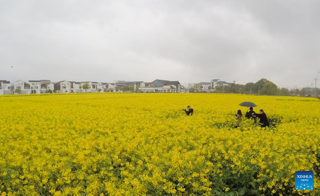 Tourists take photos in a cole flower field in Fuyang District of Hangzhou City, east China's Zhejiang Province, March 30, 2023. China has inscribed a total of 8,155 traditional villages to its state protection list in an effort to conserve the country's millennia-old agricultural civilization, official data showed. Zhejiang is among the leaders in the country's rural vitalization drive, with great efforts being made to protect the natural environment and traditional culture. (Xinhua/Weng Xinyang)