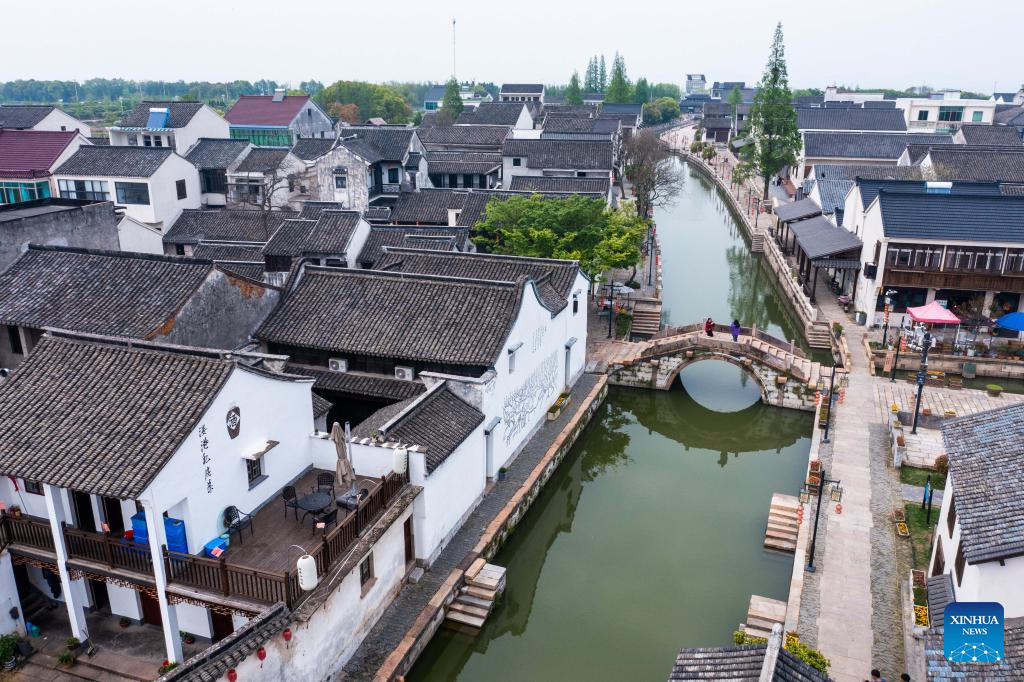 This aerial photo taken on April 11, 2023 shows the Yigao Village in Wuxing District of Huzhou City, east China's Zhejiang Province. China has inscribed a total of 8,155 traditional villages to its state protection list in an effort to conserve the country's millennia-old agricultural civilization, official data showed. Zhejiang is among the leaders in the country's rural vitalization drive, with great efforts being made to protect the natural environment and traditional culture. (Xinhua/Xu Yu)