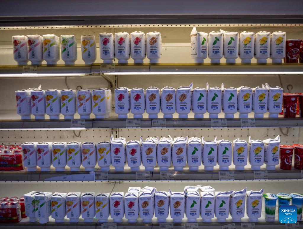 This photo taken on April 27, 2023 shows containers of yogurt stacked upside down in Lhasa, capital of southwest China's Tibet Autonomous Region. (Xinhua/Sun Fei)