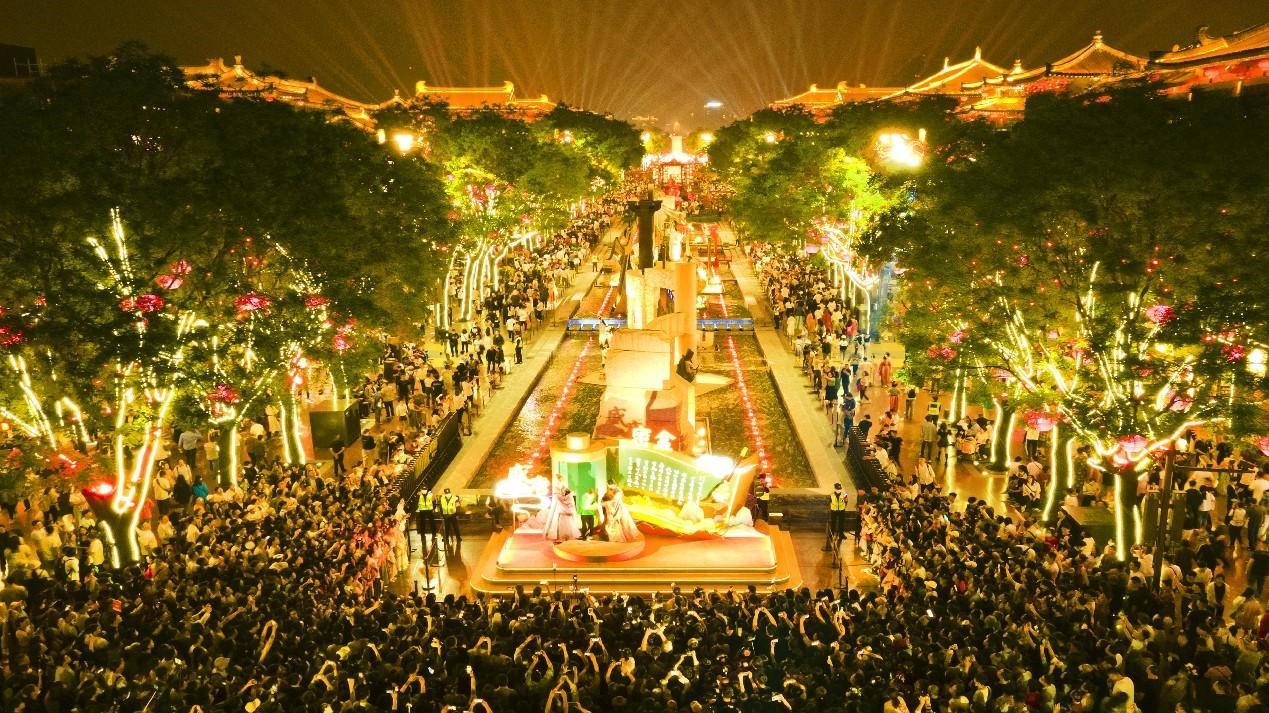 Photo taken on April 18, 2023 shows the crowded Datang Everbright City scenic area, a very popular commercial pedestrian street with Tang-style architecture and decorations in Xi'an, northwest China's Shaanxi province. (People's Daily Online/Sun Lijun)
