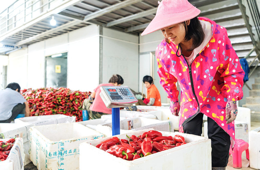 A worker packs red peppers at a production base in Xicheng village, Changle town, Hepu county, south China's Guangxi Province. (Photo/Huang Tianshi)