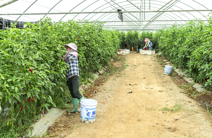Workers harvest red peppers at a production base in Xicheng village, Changle town, Hepu county, south China's Guangxi Province. (Photo/Huang Tianshi)
