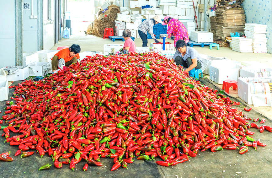 Workers select red peppers in south China's Guangxi Province. (Photo/Huang Tianshi)