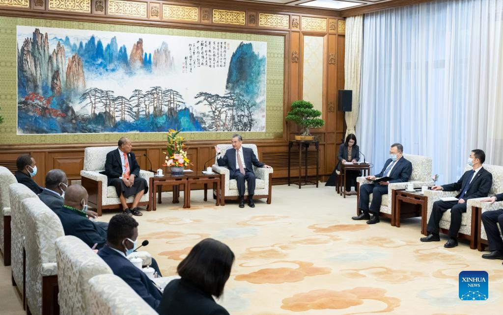 Wang Yi, a member of the Political Bureau of the Communist Party of China (CPC) Central Committee and director of the Office of the Foreign Affairs Commission of the CPC Central Committee, meets with a delegation of politicians from Pacific island countries led by Samiu Vaipulu, Tonga's Deputy Prime Minister and Minister for Justice, in Beijing, capital of China, April 27, 2023. (Xinhua/Zhai Jianlan)