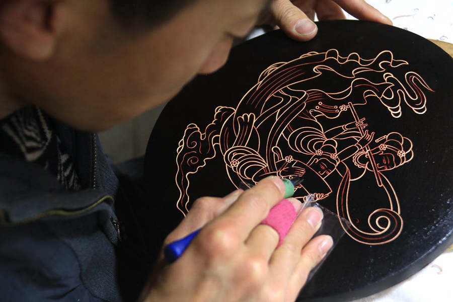 A craftsman works on a wood engraving painting at a night market in Dunhuang, northwest China's Gansu Province. (Photo/Zhang Xiaoliang)