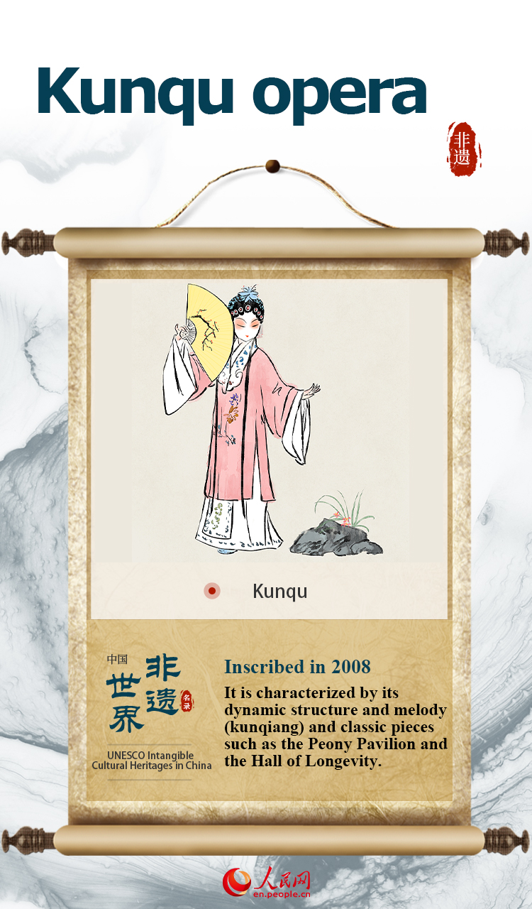 It is characterized by its dynamic structure and melody (kunqiang) and classic pieces such as the Peony Pavilion and the Hall of Longevity.