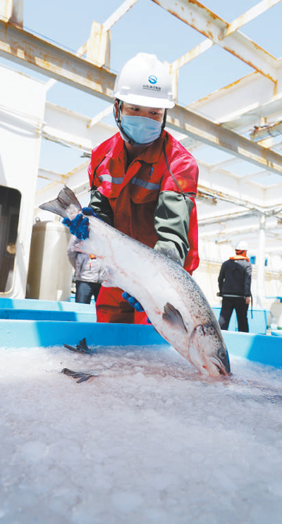 "The Atlantic salmons we harvested this time have an average weight of over 5 kg and can meet the European Union (EU)'s export standards. The harvest season is expected to last until the end of the month," said Wu Jihong, chief operating officer of Shandong Deepsea Green Breeding Co., Ltd. under Shandong Marine Group Ltd.