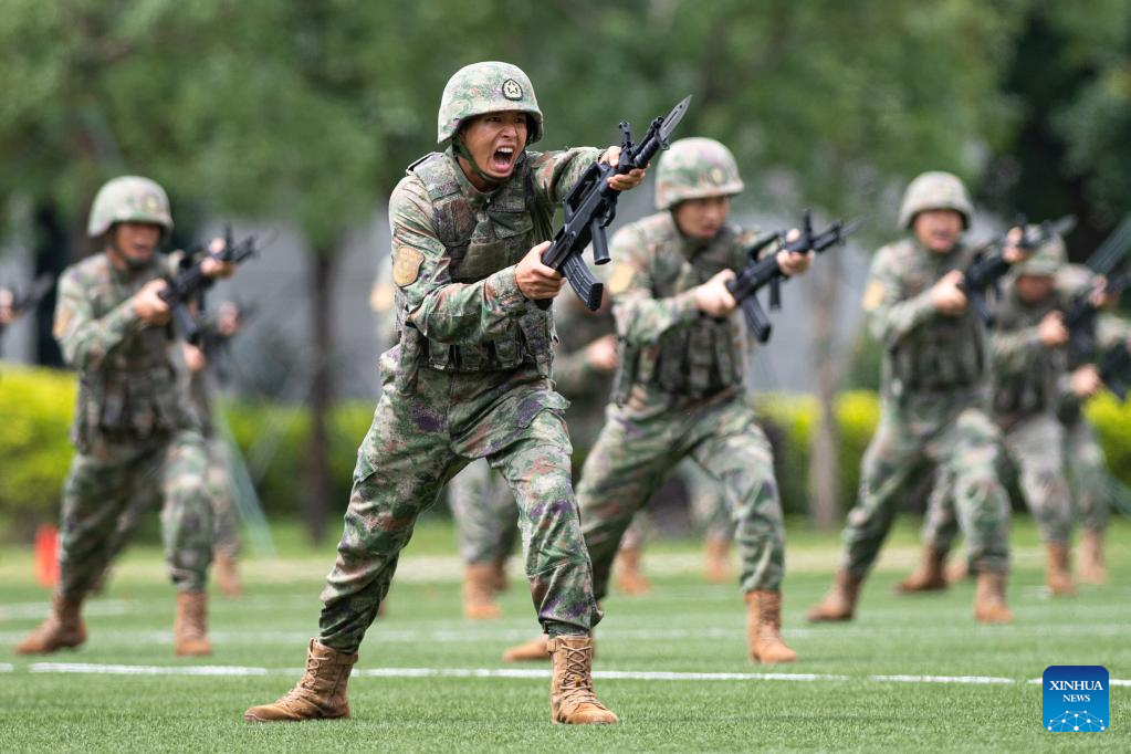 After a national flag-raising ceremony in the morning, soldiers of the garrison staged military exercises, including combatting and anti-terrorist operations, as well as theatrical performances.