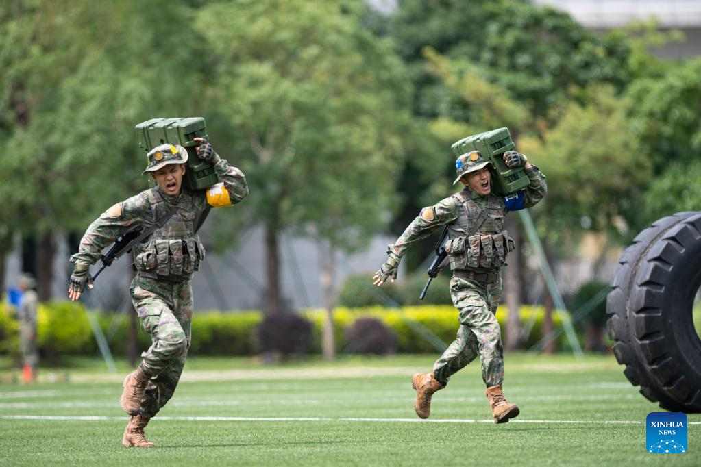 Soldiers of the Chinese People's Liberation Army Garrison stationed in the Macao Special Administrative Region stage military exercises during an open day event at the barracks on Taipa Island in Macao, south China, April 30, 2023. This was the 17th time that the barracks had been opened to the public since 2005, helping with communication between the garrison and local residents. (Xinhua/Cheong Kam Ka)