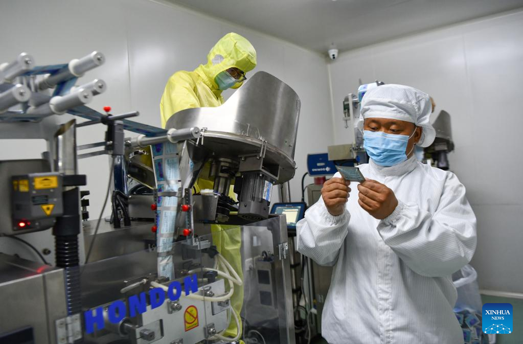 Buchung Tsering inspects the production of Tibetan medicine in Tibet Ganlu Tibetan Medicine Co., Ltd. in Lhasa, southwest China's Tibet Autonomous Region, April 20, 2023.
