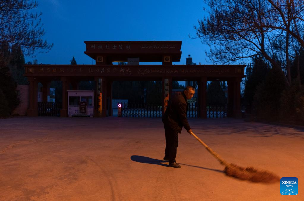 Eniwar Emer sweeps the ground at the entrance of the Yecheng Martyrs Cemetery before dawn in Yecheng, northwest China's Xinjiang Uygur Autonomous Region, April 16, 2023.