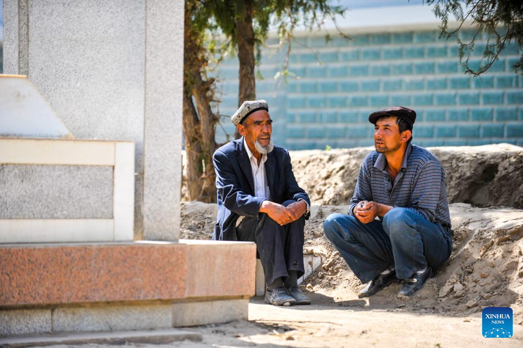 This file photo taken on April 29, 2011 shows Eniwar Emer (R) and his father Emer Yit having a chat in the Yecheng Martyrs Cemetery in Yecheng, northwest China's Xinjiang Uygur Autonomous Region.