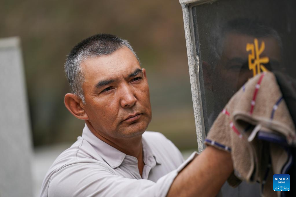 Eniwar Emer wipes a tombstone in the Yecheng Martyrs Cemetery in Yecheng, northwest China's Xinjiang Uygur Autonomous Region, April 16, 2023.
