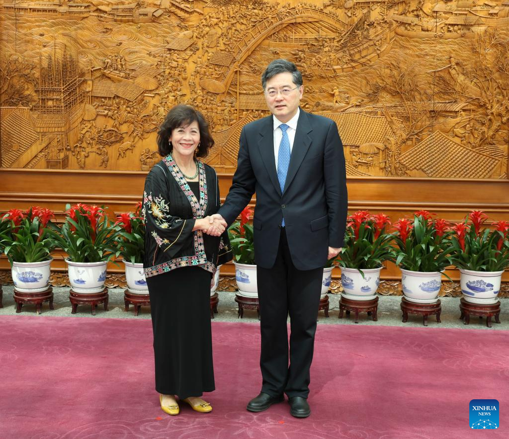 BEIJING, May 1 (Xinhua) -- Chinese State Councilor and Foreign Minister Qin Gang met with Noeleen Heyzer, special envoy of the secretary-general of the United Nations (UN) for Myanmar, in Beijing on Monday.