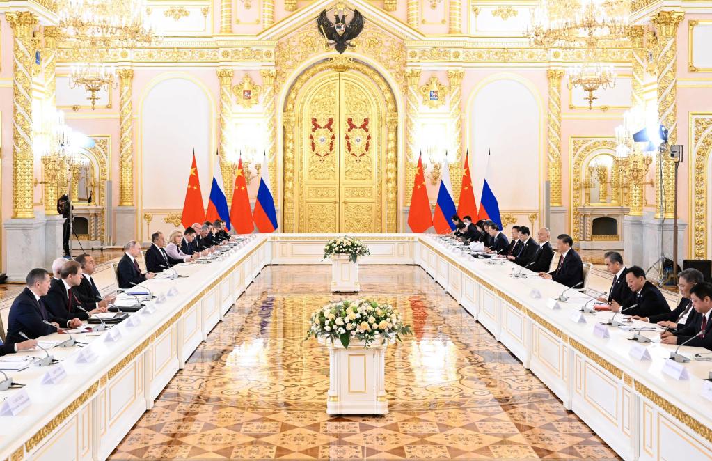 Chinese President Xi Jinping and Russian President Vladimir Putin hold large-group talks at the Kremlin in Moscow, Russia, March 21, 2023. (Xinhua/Shen Hong)