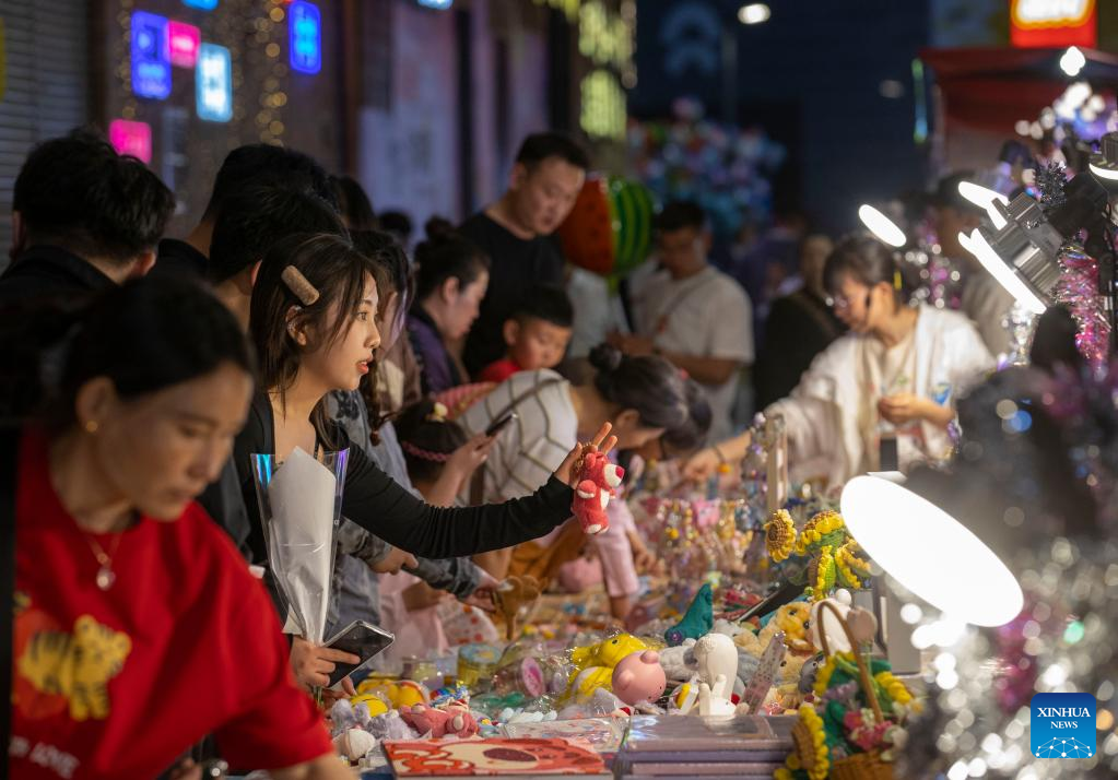 Tourists select goods at a night market in Jinfeng District of Yinchuan, northwest China's Ningxia Hui Autonomous Region, May 2, 2023. Yinchuan has been making efforts to bolster its nighttime economy in recent years. (Xinhua/Yang Zhisen)