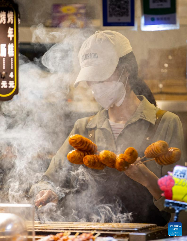 A vendor cooks snacks at a market in Jinfeng District of Yinchuan, northwest China's Ningxia Hui Autonomous Region, May 2, 2023. Yinchuan has been making efforts to bolster its nighttime economy in recent years. (Xinhua/Yang Zhisen)