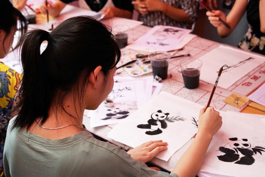 A Vietnamese student works on a Chinese painting during an event celebrating the 14th annual United Nations Chinese Language Day at Hanoi University in Vietnam, April 21, 2023. TO GO WITH "UN Chinese Language Day celebrated in Confucius Institute at Hanoi University" (Xinhua/Hu Jiali)