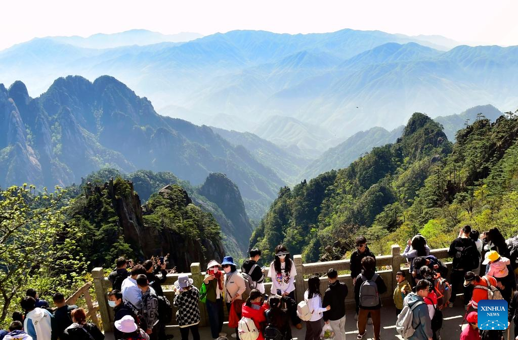 Tourists visit Huangshan Mountain in east China's Anhui Province on April 30, 2023. Huangshan, one of China's most famous mountains, is known for its majestic scenic beauty, strange rocks, cloud-shrouded peaks and ancient pines. It was listed as a UNESCO World Heritage Site in 1990. (Photo by Cai Ji'an/Xinhua)