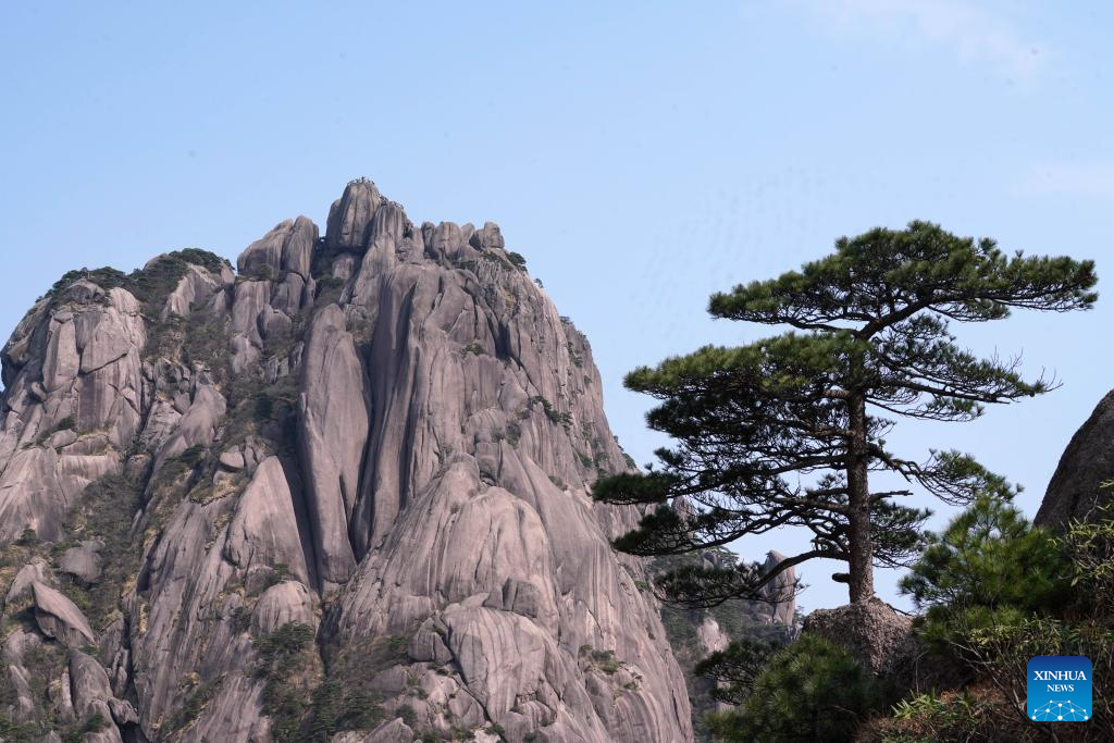 This photo taken on April 10, 2023 shows the Lianhua Peak and a pine tree on Huangshan Mountain in east China's Anhui Province. Huangshan, one of China's most famous mountains, is known for its majestic scenic beauty, strange rocks, cloud-shrouded peaks and ancient pines. It was listed as a UNESCO World Heritage Site in 1990. (Xinhua/Ma Ning)