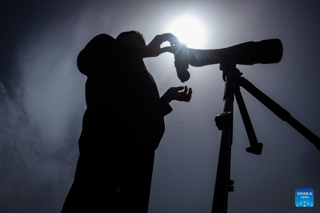 Staff member Zhang Yuming observes milu deer with a telescope at Shishou Milu Deer National Nature Reserve in central China's Hubei Province, April 29, 2023. (Xinhua/Wu Zhizun)