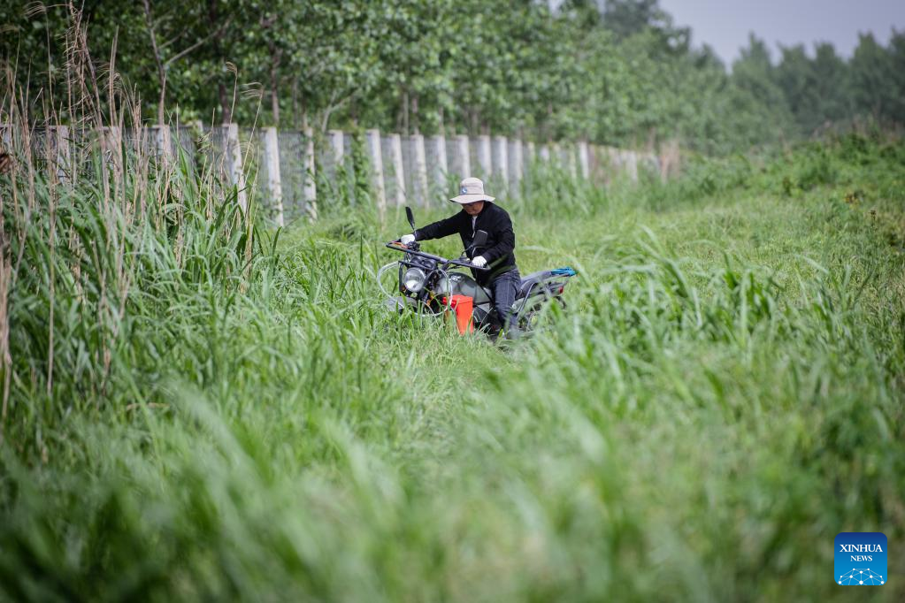 Ranger Wang Chuanjun checks wire netting at Shishou Milu Deer National Nature Reserve in central China's Hubei Province, April 29, 2023. (Xinhua/Wu Zhizun)