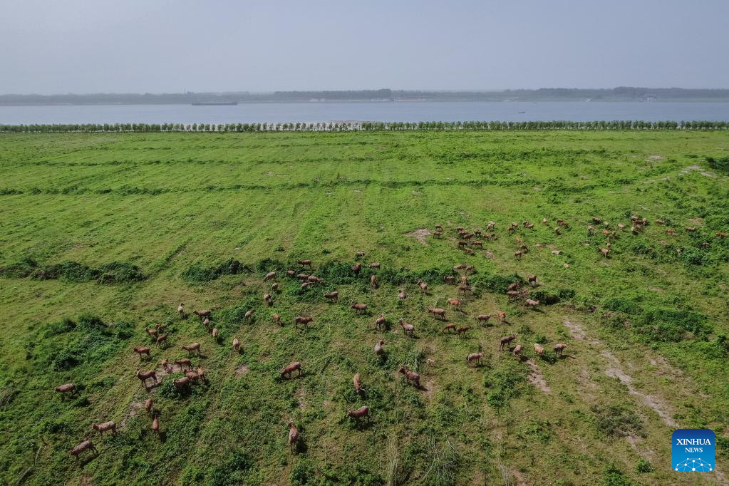 This aerial photo taken on April 29, 2023 shows milu deer at Shishou Milu Deer National Nature Reserve in central China's Hubei Province. (Xinhua/Wu Zhizun)