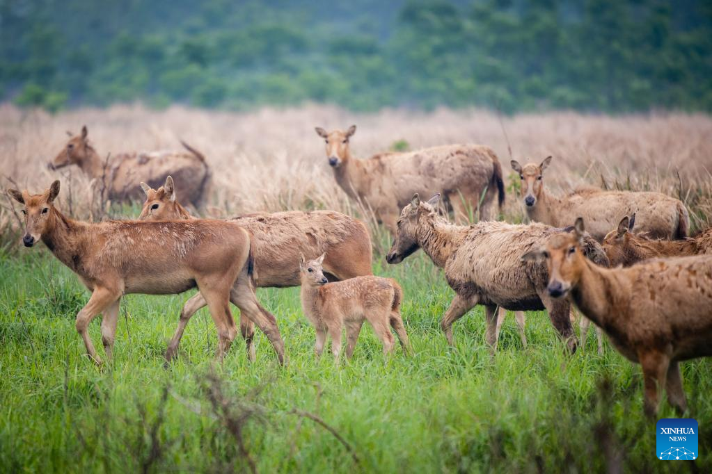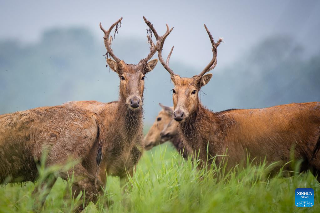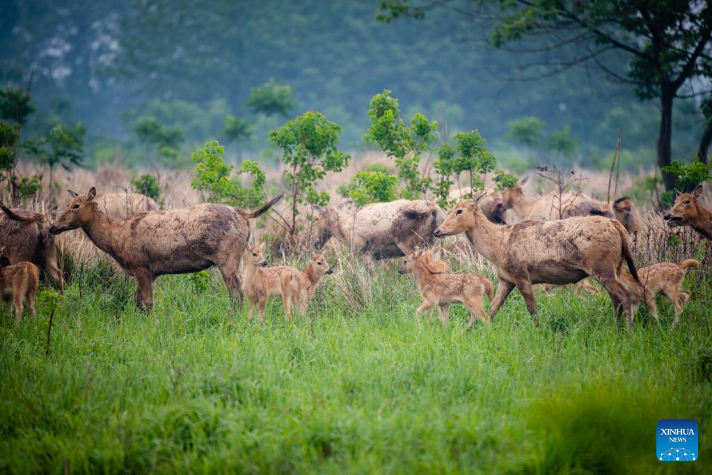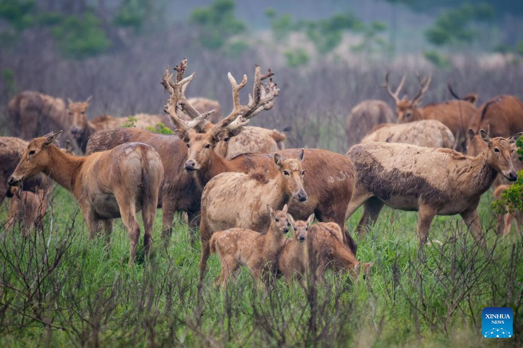 This photo taken on April 28, 2023 shows milu deer at Shishou Milu Deer National Nature Reserve in central China's Hubei Province. (Xinhua/Wu Zhizun)