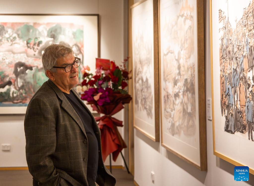 A visitor looks at an artwork at the "Profound and Lasting - Painting Exhibition from Ren Jianguo, Ren Guozhong and Ren Lihong" held in Sydney, Australia, on May 4, 2023. A painting exhibition opened here on Thursday, featuring over 60 artworks created by Chinese Australian artists to boost dialogue between Eastern and Western cultures.(Photo by Hu Jingchen/Xinhua)