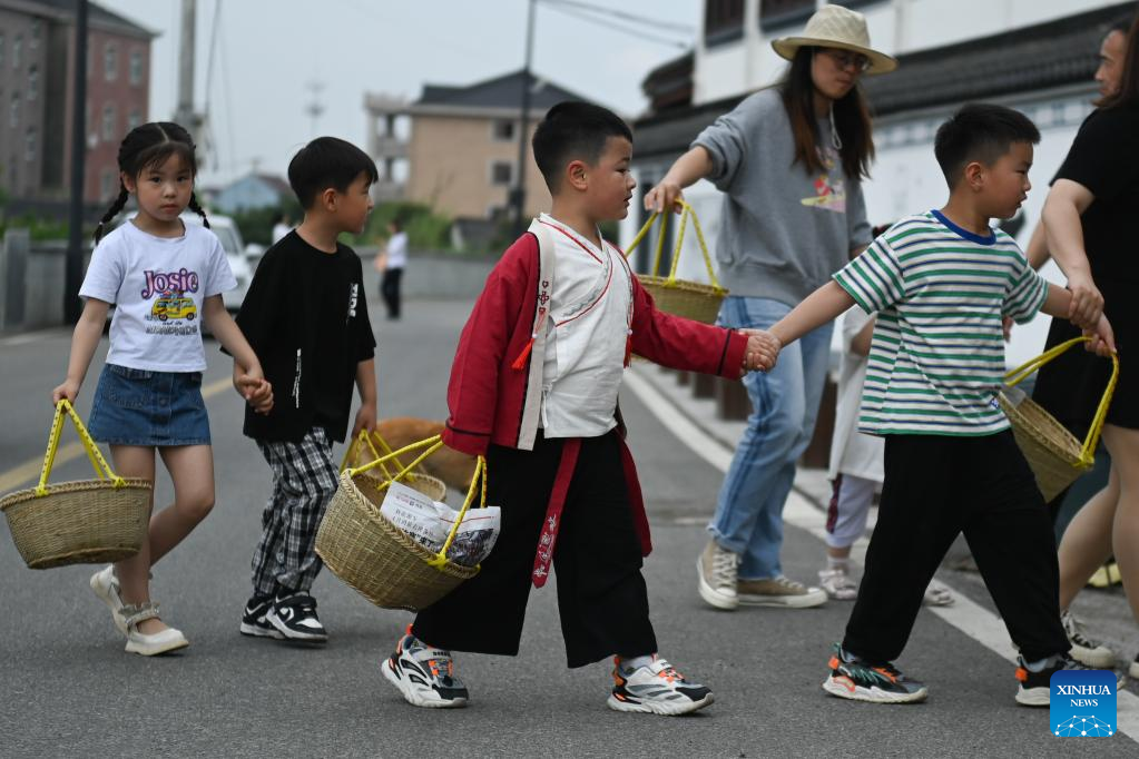 Children collect rice from neighbors to make meals at Dingshanhe Village, Tangqi Township, Linping District of Hangzhou, east China's Zhejiang Province, May 4, 2023. Villagers mark the upcoming "Lixia", or beginning of summer, by making various kinds of traditional food here. "Lixia" falls on May 6 this year. (Xinhua/Huang Zongzhi)