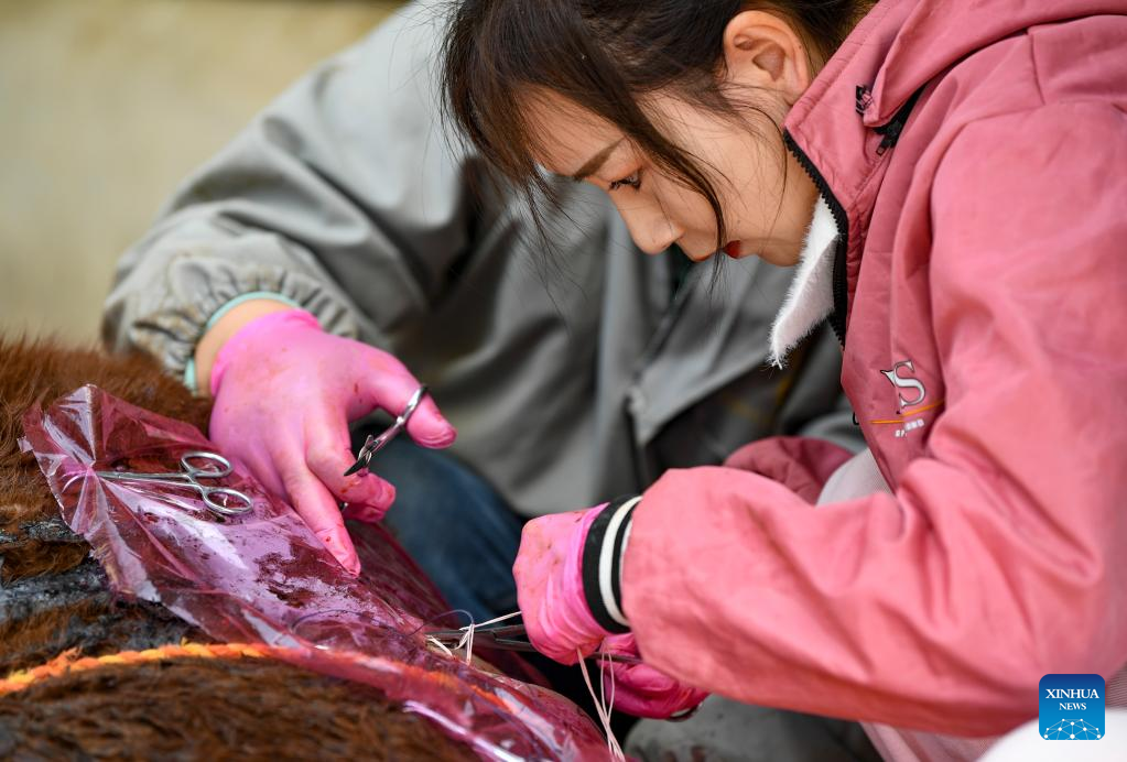 Veterinarian Bai Hua sutures the wound of a cow owned by a villager in Yuanzhou District, Guyuan, northwest China's Ningxia Hui Autonomous Region, April 18, 2023. (Xinhua/Feng Kaihua)